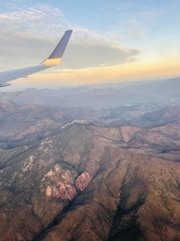 Dass mir auf diesem Flug ein Fensterplatz zugeteilt wurde, war zugleich Zufall und großes Glück. Nach einer Nacht mit ein wenig Schlaf wurde es in dem Morgenstunden gerade noch rechtzeitig hell. Der Anflug auf Santiago über die Anden war verstärkt durch den Sonnenaufgang über Chile beeindruckend.